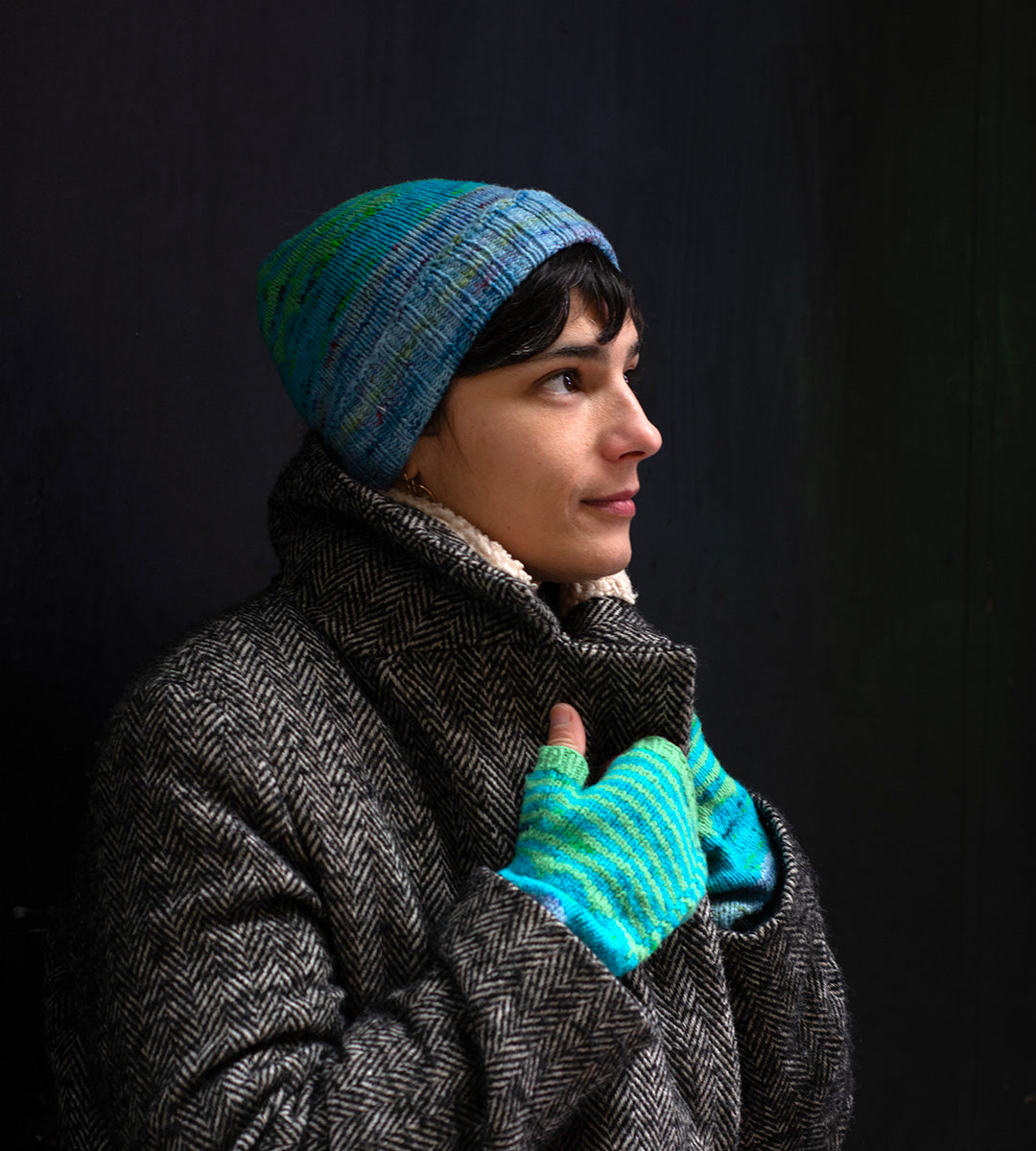 I guanti colorati sono progettati per abbinarsi al cappello da tramoggia di montagna di Kirsten Kapur. Hanno un polsino lungo per un maggiore calore e sono pensati per essere indossati con un po' di leggerezza.