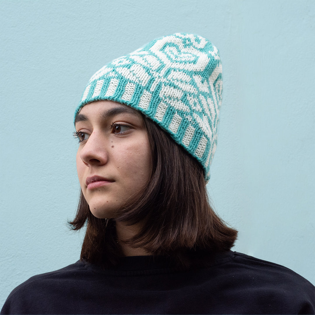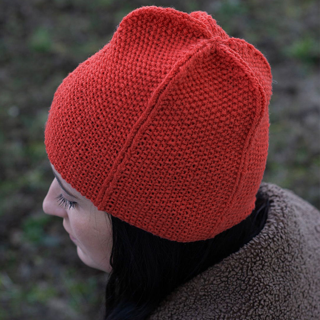 Lavorato in tondo, questo cappellino sbarazzino presenta coste ondulate, motivi a cuore dolce e una forma divertente e leggermente appuntita per quando ti senti particolarmente sbarazzino.