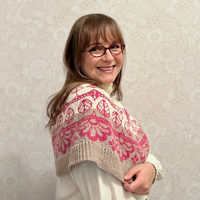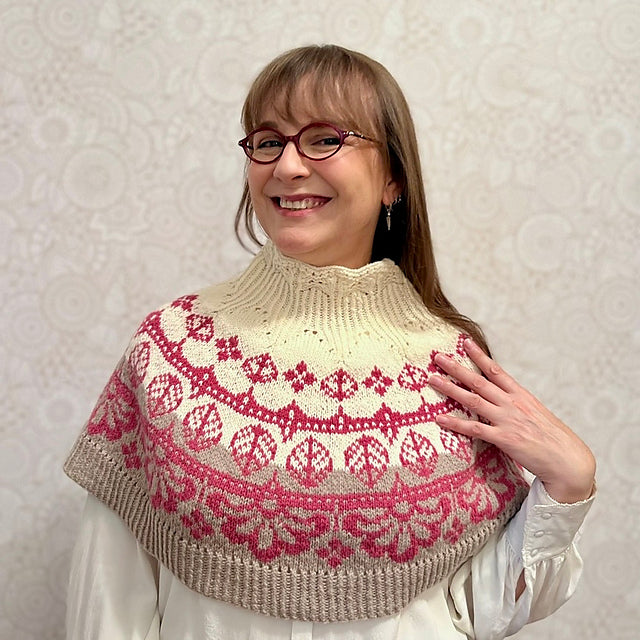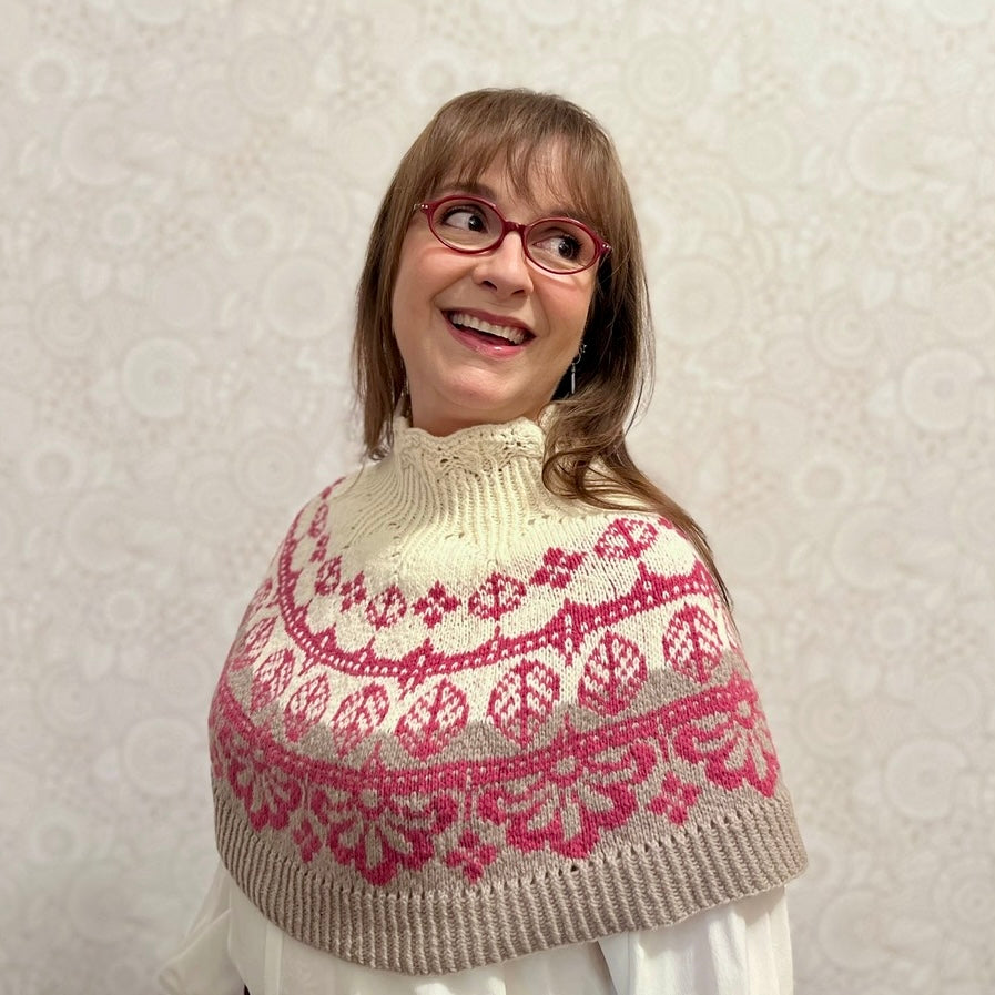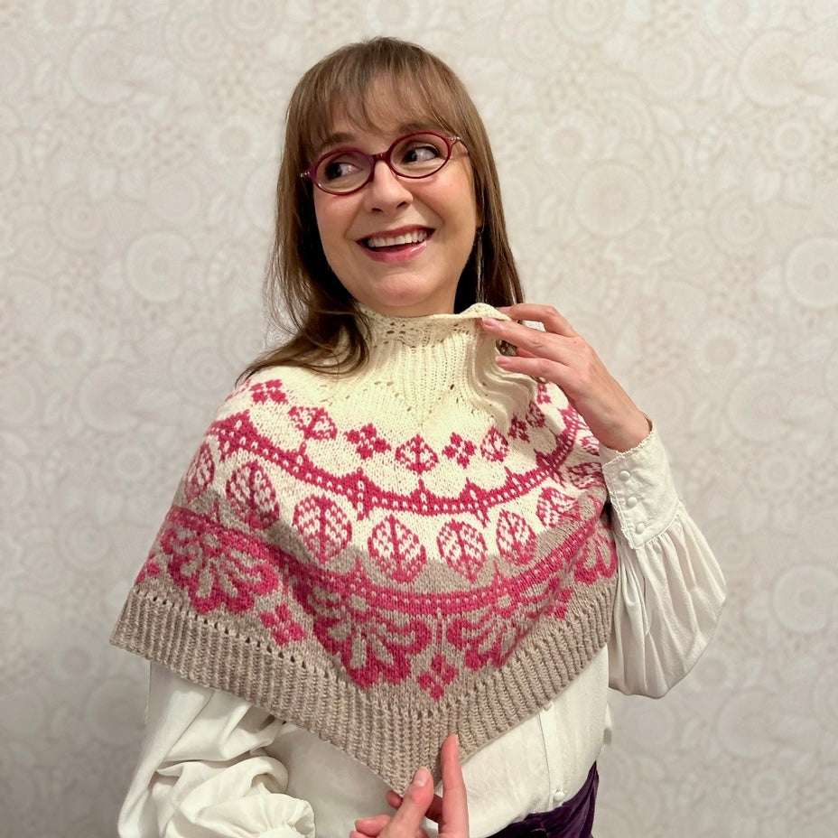 Inizi dalla parte superiore con un bordo decorativo in pizzo che si trasforma in coste ritorte. Subito dopo l'apertura del collo si prosegue con una serie di aumenti decorativi per modellare le spalle. Lo sprone è lavorato con un motivo a colori intrecciati ed è modellato utilizzando una serie di aumenti nascosti nella tabella dei motivi a colori.