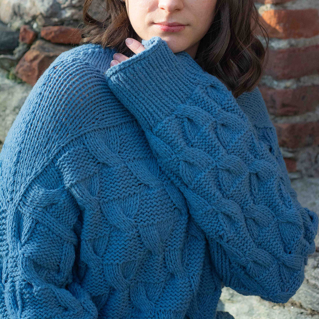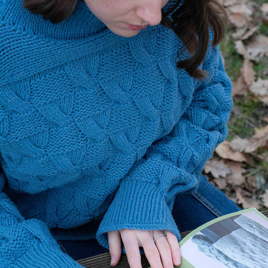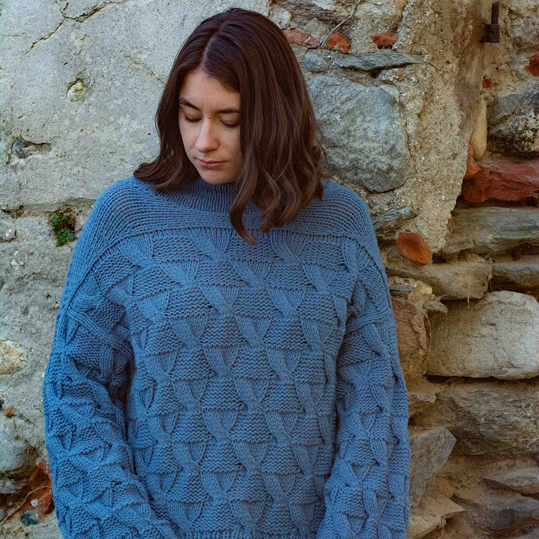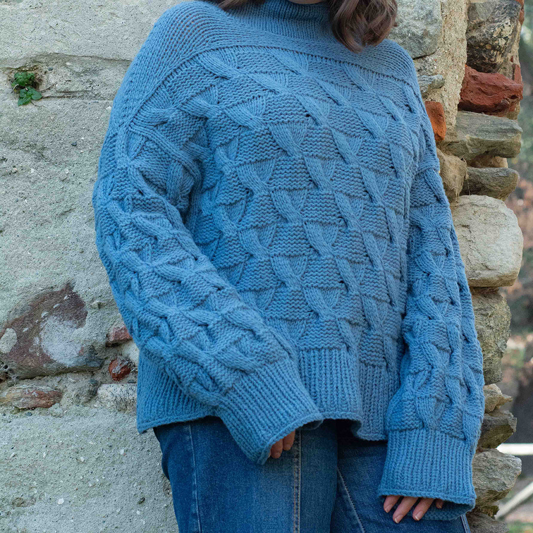 Il maglione Hiekka nasce da una costruzione dall'alto verso il basso, ma con un tocco di originalità rispetto al metodo tradizionale per rendere l'inizio più piacevole. La vestibilità comoda, abbinata a maniche leggermente più lunghe, crea una silhouette comoda e oversize che cade morbidamente e avvolge il corpo in tutta comodità. Il motivo a punto ricorda una clessidra o i motivi spazzati dal vento che appaiono sulla sabbia, e il filato grezzo utilizzato conferisce al maglione una finitura meravigliosamente ampia e voluminosa.