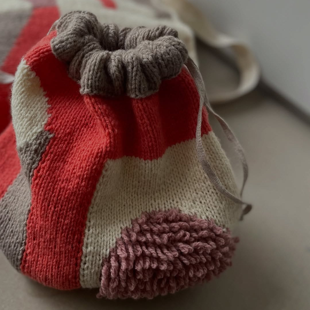 La borsa Ito Ito può essere lavorata a maglia come tote bag o come borsa con coulisse. Oltre alle forme colorate, un lato presenta un motivo stilizzato del carattere 「糸」, che in giapponese significa "filato". L'altro lato riporta la parola "ITO", la pronuncia del carattere. Da qui il nome della borsa, Ito Ito Bag.