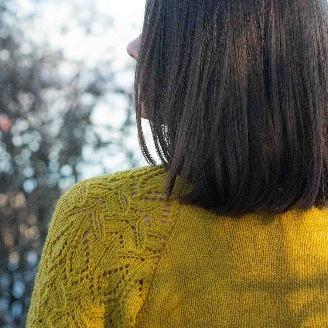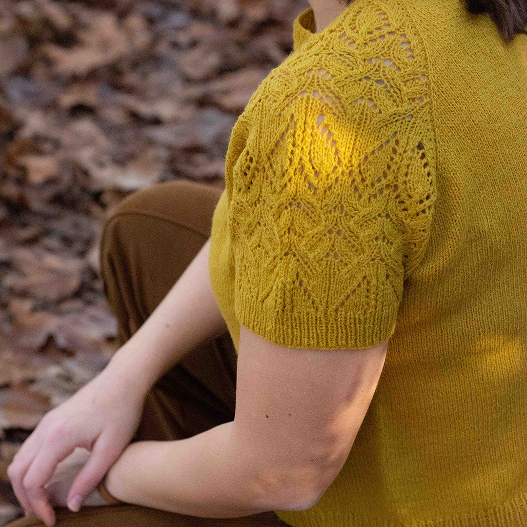 La maglietta raglan Juno è lavorata senza cuciture dall'alto verso il basso. La scollatura è lavorata in piano, dopodiché il resto della maglietta è lavorato in tondo. Il motivo traforato è lavorato sulle maniche, mentre il davanti e il dietro della maglietta sono lavorati a maglia rasata.