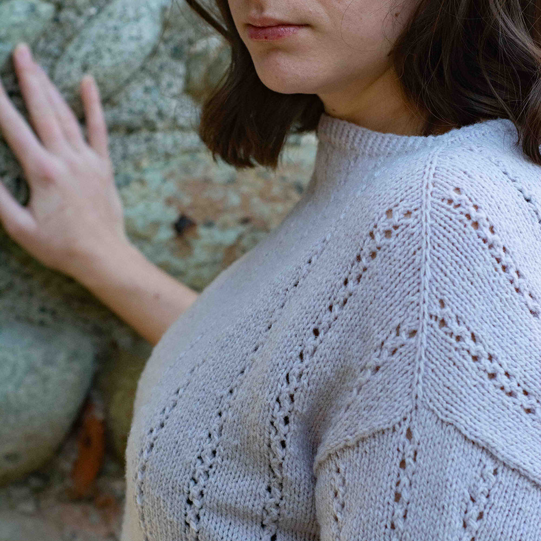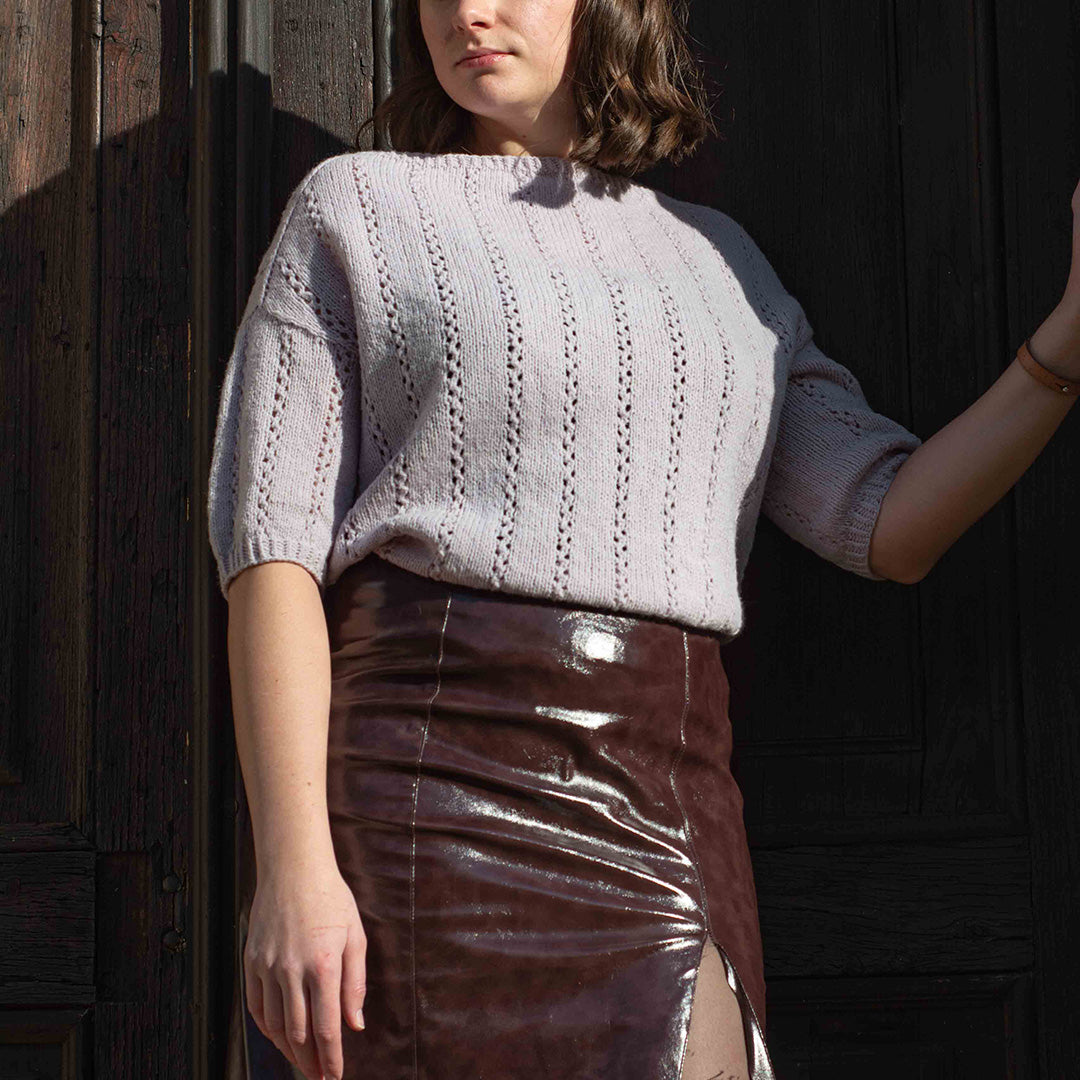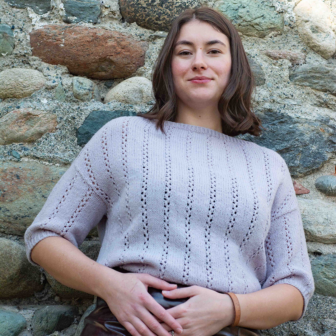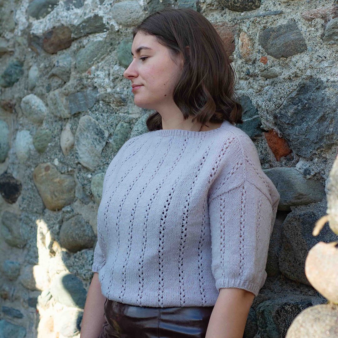SHORE TEE è un top femminile con un motivo traforato semplice e grazioso. Il design è lavorato dall'alto verso il basso. Per prima cosa, il bordo del collo e la parte superiore del carré vengono lavorati in tondo. Il carré viene poi diviso in davanti e dietro, e ogni sezione viene lavorata avanti e indietro fino al fondo del giromanica. La sezione posteriore è lavorata più lunga della sezione anteriore per spingere in avanti la linea delle spalle, creando una vestibilità comoda. Il corpo viene poi lavorato dall'alto verso il basso fino al bordo. Le maniche vengono riprese dal giromanica, modellate con ferri accorciati all'estremità e poi lavorate dall'alto verso il basso in tondo. Sia l'orlo che i bordi delle maniche sono rifiniti con brevi sezioni a coste ritorte.